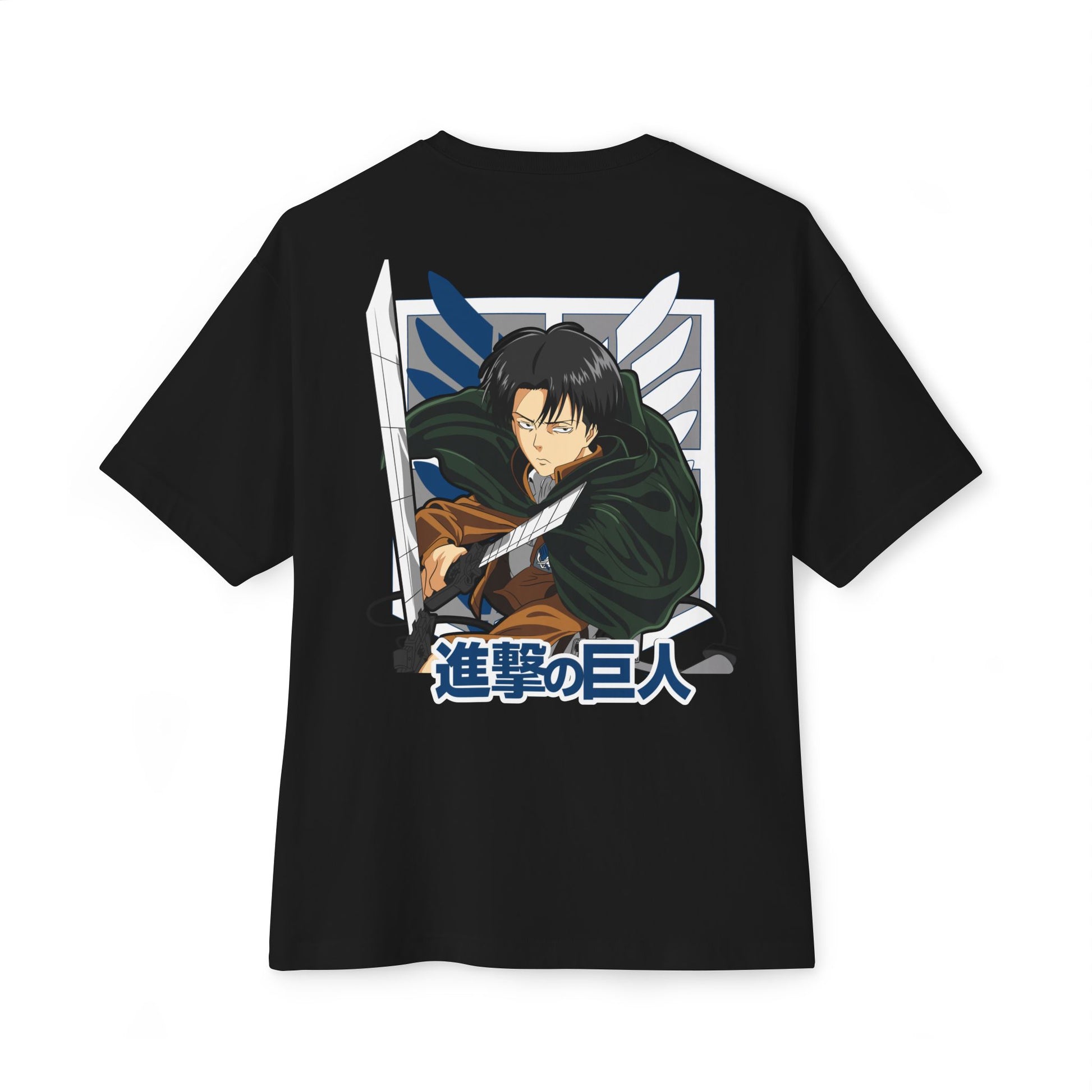 Camiseta negra oversize. Logo bordado en el pecho con imagen de Levi Ackerman en DTF en la espalda.
