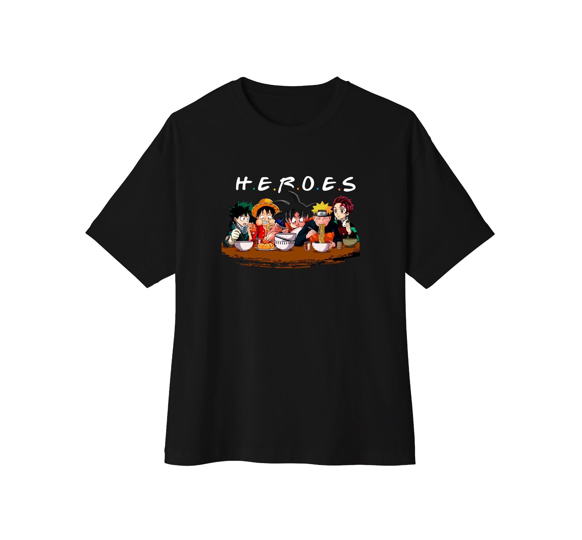 Camiseta negra oversize con diseño DTF de heroes de animes