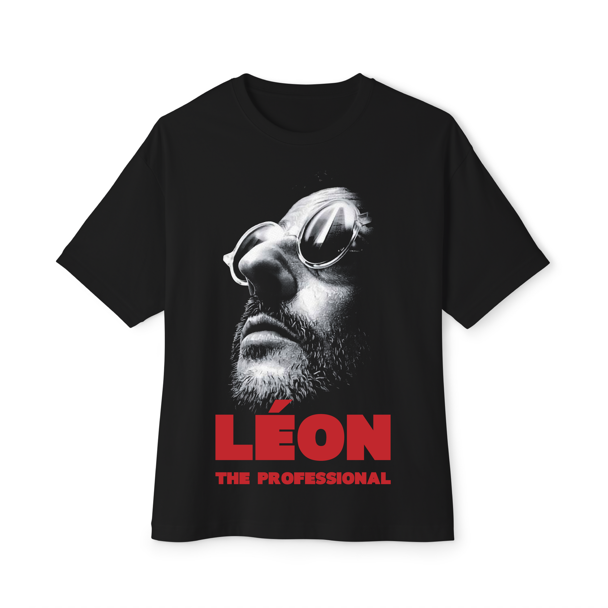 Camiseta negra oversize diseño Leon El Profesional hecho en semitonos DTF